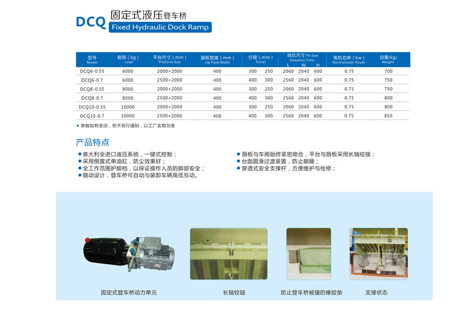 特点:固定登车桥与移动式登车桥功能上基本相同, 前者固定于月台边缘,利用电动液压装置调节平台高度与卡车搭接. 后者用于平地上装卸卡车货物,且动力为手动液压装置.
